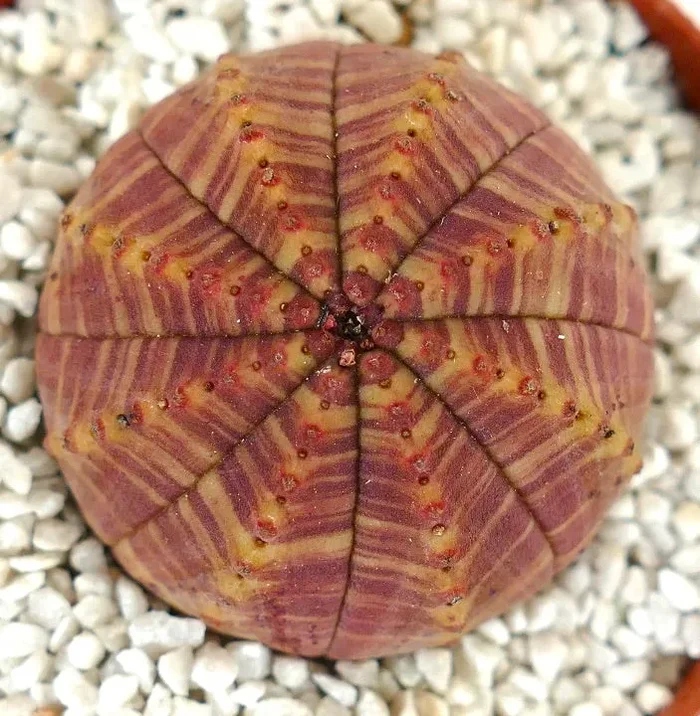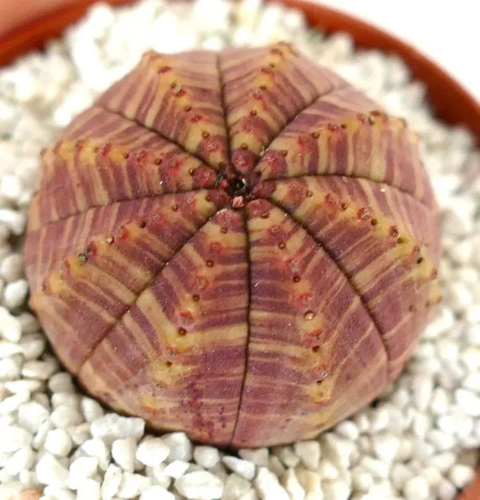 Euphorbia symmetrica è una succulenta sorprendente dalla forma perfettamente rotonda e geometrica. La sua superficie liscia e verde è divisa in coste distinte che si irradiano simmetricamente dal centro. Piccoli fiori bianchi emergono lungo le coste, aggiungendo un sottile contrasto alla struttura audace. Originaria del Sudafrica, questa pianta compatta rimane spesso di piccole dimensioni, rendendola ideale per la coltivazione in vaso. La succulenta immagazzina acqua all’interno del suo corpo carnoso e spesso, permettendole di prosperare in condizioni aride. Euphorbia symmetrica si distingue per la sua bellezza architettonica, con una forma unica e un motivo intricato che creano un senso di armonia.