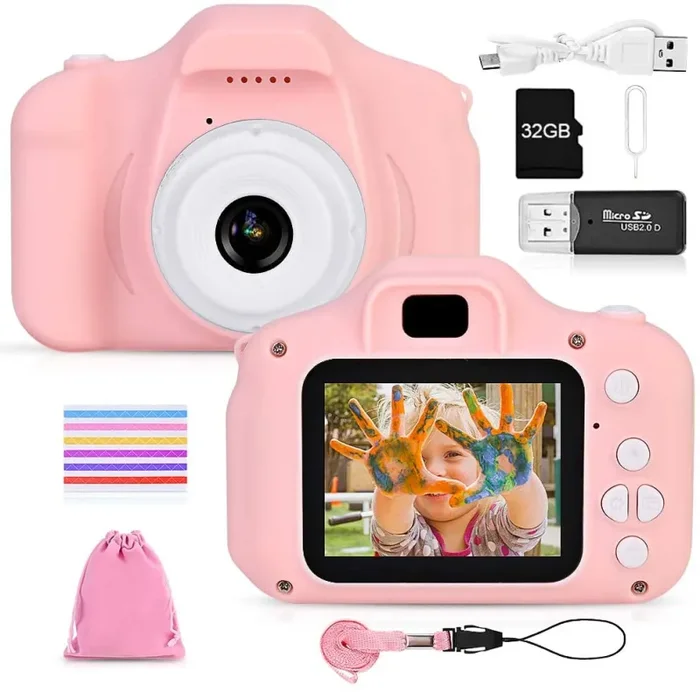 Macchina Fotografica per Bambini è dotata di una scheda di memoria 32G di grande capacità e di un lettore di schede (la fotocamera non può scattare senza la scheda, questa fotocamera supporta fino a 32G card, può contenere più di 10.000 foto), cavo di ricarica USB, cordino.