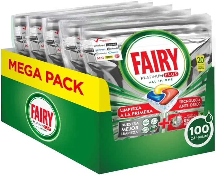 Fairy Platinum Plus Allin1 Pastiglie Lavastoviglie, 100 Cicli, 5 x 20 Capsule, Detersivo al Limone, Maxi Formato, Brillantezza Originale, Tecnologia Anti-Opaco con Azione Brillante Fairy Platinum Plus Limone 100 Capsule