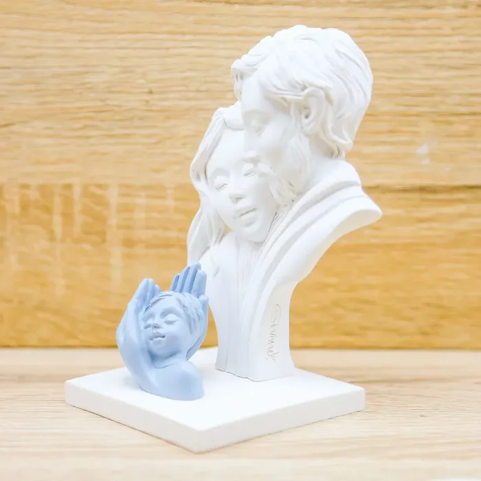 Statuina Stilizzata di una famiglia e il/la bimbo/a che viene sorretto dalle “mani protettrici”, firmato Giovinarte.
