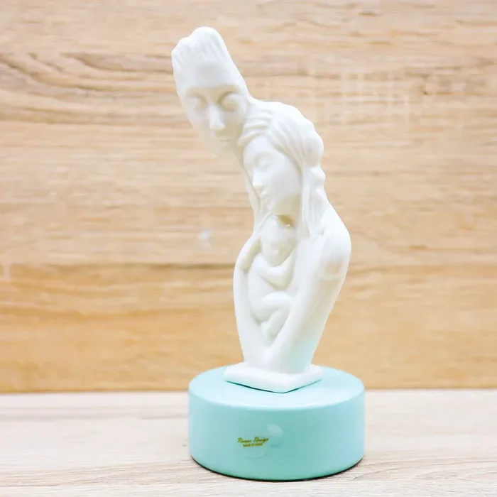 Statuina Stilizzata di una famiglia con bimbo tra le braccia e base celeste, firmato Pienne Design.