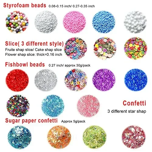 - Quantità: 35 pacchi in totale, inclusi 5 perline per acquario, 6 sfere di gommapiuma, 4 fogli di zucchero, 6 giltter, 5 contenitori, 3 fette di frutta, 3 confetti iniziali, 3 strumenti di melma