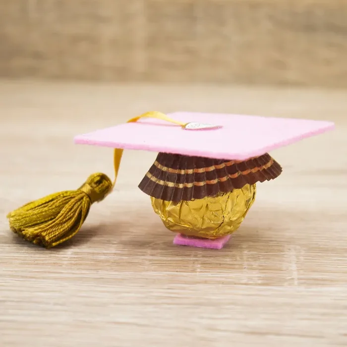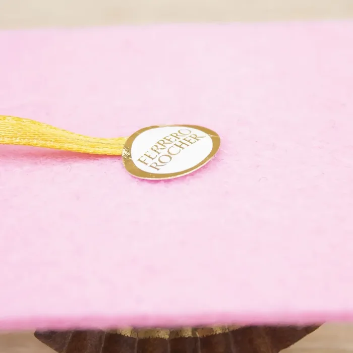 Ferrero Rocher decorato con tessuto rosa e nappina oro.