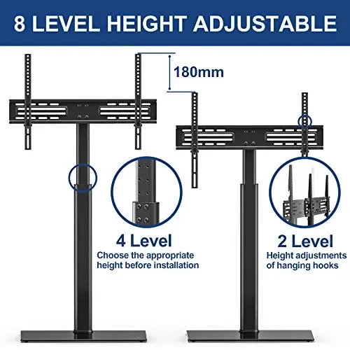 • 【Girevole e regolabile in altezza】 – Il supporto TV può ruotare di 70 gradi da sinistra a destra. Fornisce un ampio angolo di visione per la migliore esperienza visiva. Dispone di 8 livelli di regolazione in altezza, soddisfa le diverse dimensioni della TV. Può anche prevenire la spondilosi cervicale e alleviare l’affaticamento.