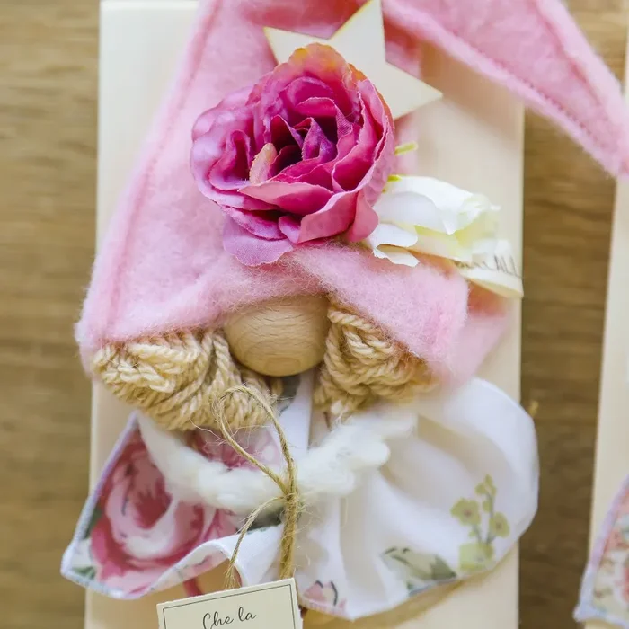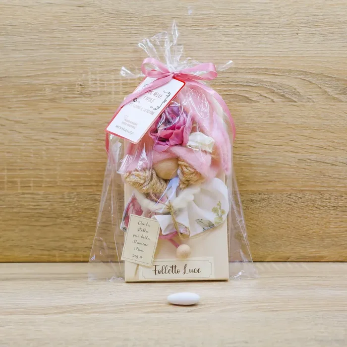 Quadretto in legno, Folletto della Luce con abito decorato con rose, testa, piedini e stella in legno, cappello rosa, applicazione di fiori e frase: “Che la stellai più bella illumini i tuoi sogni”, firmato Beccalli for Life.