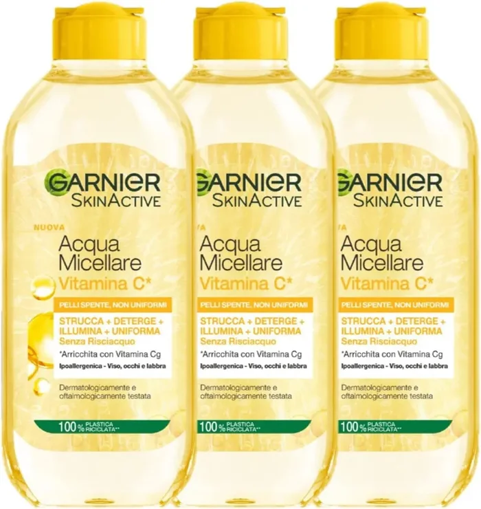 - Contenuto: 1x Garnier Acqua Micellare Tutto in 1 Skinactive, Con Vitamina C, Per Pelli Spente e Non Uniformi, Senza Risciacquo, 3 x 400 ml