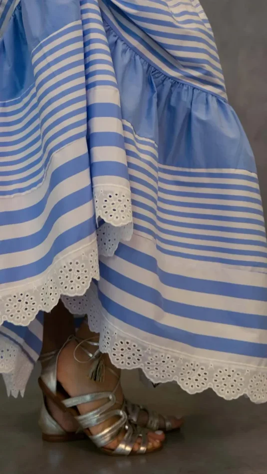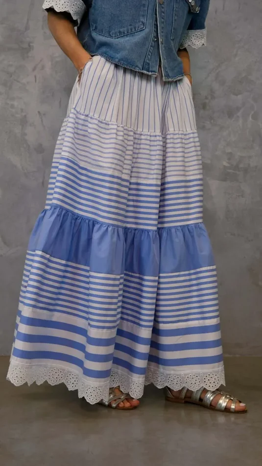 Gonna a righe con balza pizzo sangallo, elastico in vita, geometrie biancHe e celesti si alternano in questa meravigliosa gonna, abbinala con la camIcia in denim mezza manica.