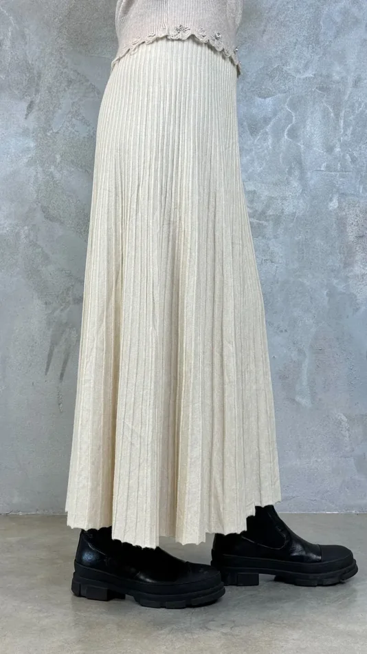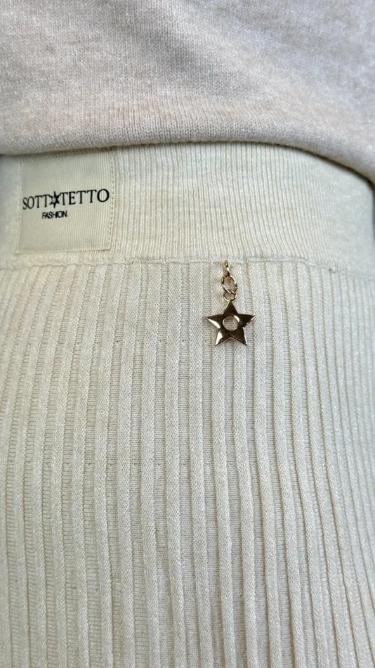Gonna a ruota in maglia elasticizzata e con elastico in vita, morbida calda, femminile, perfetta con la maglia a “V” con Swarovski.