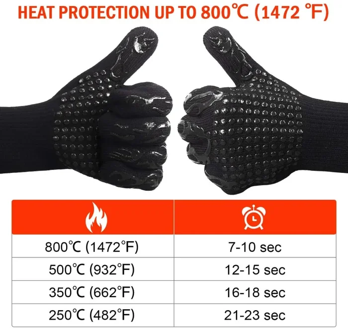 • I guanti da barbecue certificati EN407 offrono la massima protezione dal calore fino a 800 ° C per 10 secondi.