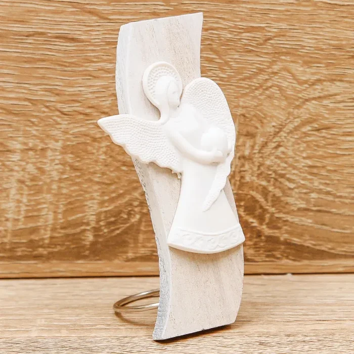 Icona Shabby Angioletto Linea ‘New Art’ con base ondulata in legno e Sacra Famiglia in resina bianca. Gancio per appoggiarlo in metallo.