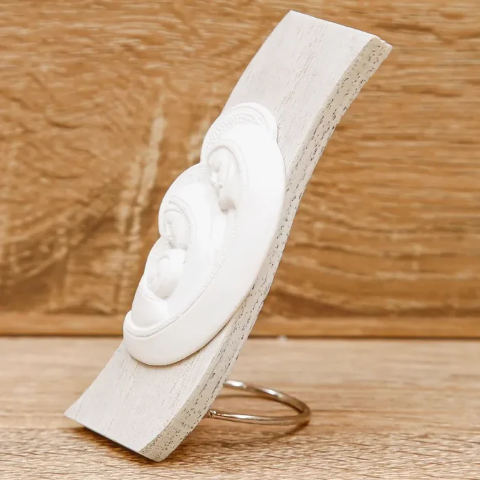 Icona Shabby Sacra Famiglia Linea ‘New Art’ con base ondulata in legno e Angioletto in resina bianca. Gancio per appoggiarlo in metallo.
