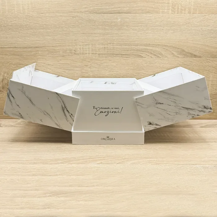 Il prezzo con la confezione comprende: Astuccio Orchidea, Doppio Nastro, Gessetto o Fiore a Scelta, Portaconfetti e 5 Confetti.