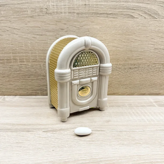Cassa Bluetooth e Modalità FM radio in metallo a forma di Jukebox di colore tortora e con rifiniture laminate oro.