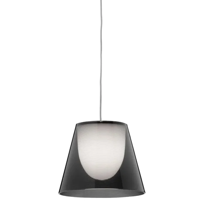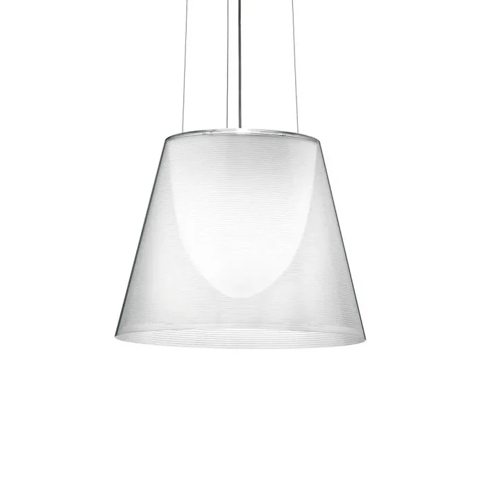 Lampada con diffusore esterno in polimetilmetacrilato (PMMA) con finitura interna aluminata. Diffusore interno in policarbonato (PC) con finitura bianco opaco. Cavo di sospensione/elettrico singolo. Rosone di colore bianco.