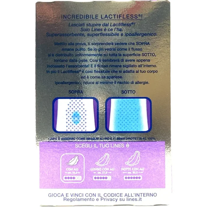 Scopri la qualità e la sicurezza di Lines È Assorbenti in Lactifless con Ali x8. Affronta ogni giorno con la tranquillità di una protezione avanzata e confortevole.