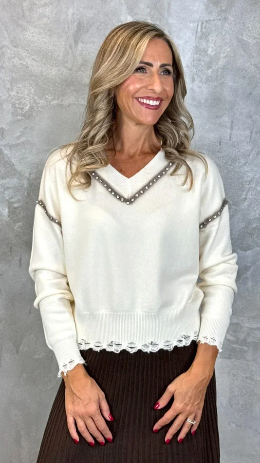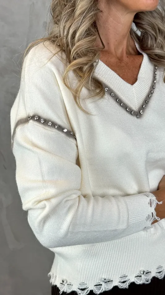 Maglia a “V” con Swarovski con piccoli finti strappetti sui polsini e sul fondo. Perfetto l’accostamento con la gonna in maglia della collezione AI 24/25.