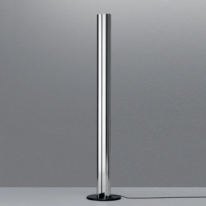 Base in acciaio rivestita con resina termoplastica; corpo in alluminio verniciato lucido. Lampadina inclusa, con regolatore d’intensità luminosa.