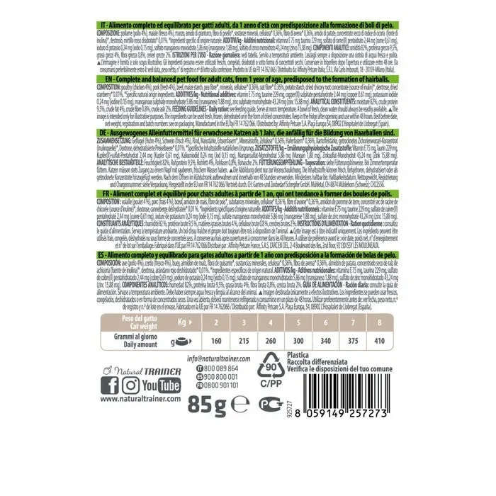 Natural Trainer Cat Adult Hairball con Pollo 85g