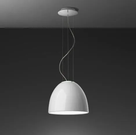 Lampada a sospensione con corpo lampada in alluminio verniciato; diffusore in materiale termoplastico; calotta superiore in vetro borosilicato. All’emissione diretta si aggiunge un’emissione indiretta che produce un alone di luce decorativo sul soffitto.