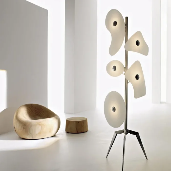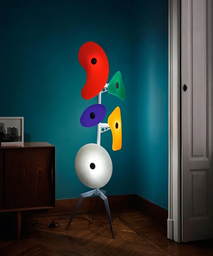Lampada da terra realizzata con lastre policromatiche o bianche e poliformi in vetro serigrafato, montate su una struttura in metallo laccato.