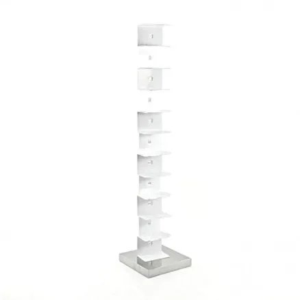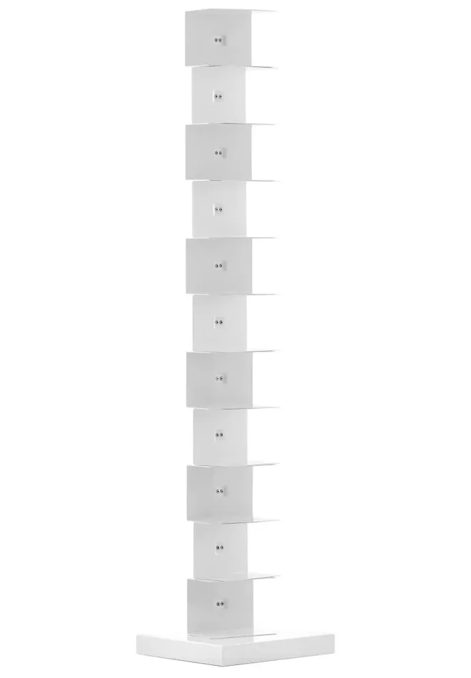 Libreria verticale self standing. Base incisa con la firma del designer (Bruno Rainaldi). Nota: capacità circa 35/70/95 volumi. La portata massima di ogni mensola è 2 kg. Finitura: struttura e mensole in metallo nero opaco, acciaio inox lucido (interno mensole in finitura satinato), laccato bianco lucido o ferro grezzo con verniciatura trasparente opaca. Base in acciaio inox lucido, metallo nero opaco, laccato bianco lucido o ferro grezzo con verniciatura trasparente opaca.