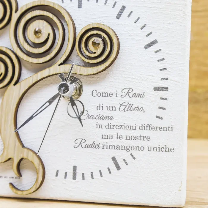 Orologio quadrato con Albero in legno e frase: “Come i Rami di un Albero, cresciamo in direzioni differenti ma le nostre Radici rimangono uniche”, firmato Negó.