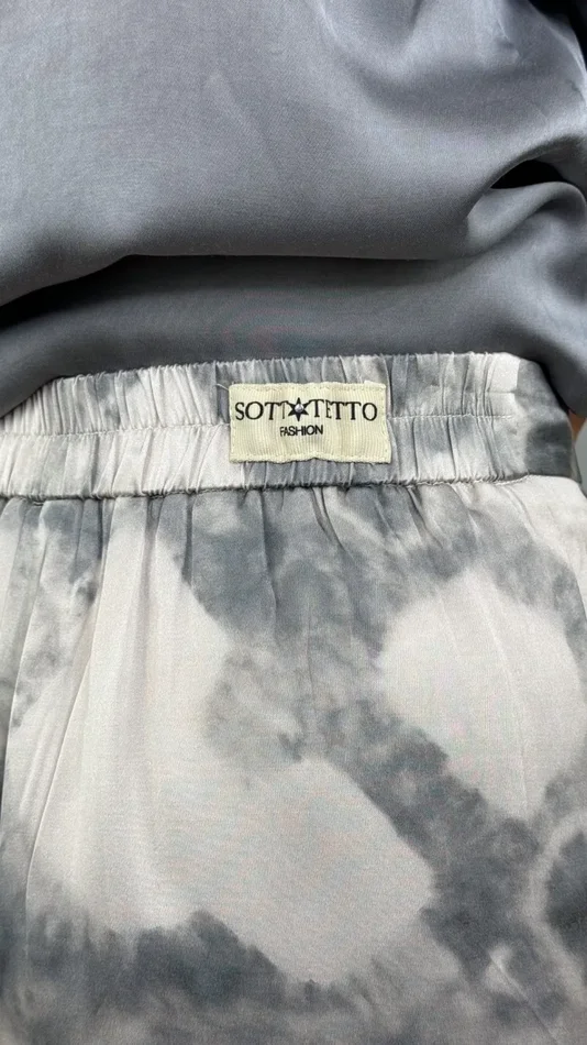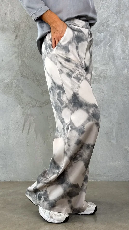 Pantalone palazzo morbido con elastico dietro e tasche a uomo. Meravigliosa fantasia sfumata dai toni del beige e grigio scuro.