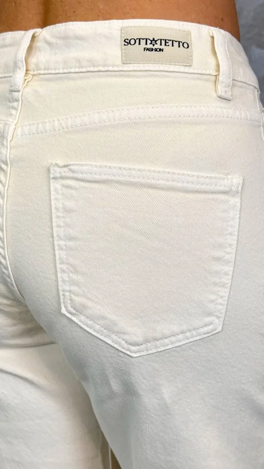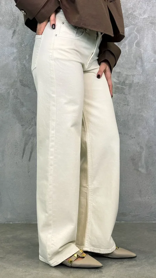 Pantalone palazzo in cotone color burro, elasticizzato, push-up e vita alta, perfetto con il trench cioccolato della nuova collezione SS25.