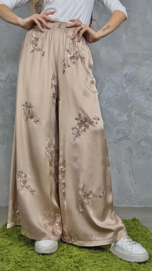 Elegante e prezioso con elastico in vita, il pantalone palazzo tutto ricamato tono su tono nella nuance beige. Raffinatissimo con la camicia bianca della nuova collezione SS 24.