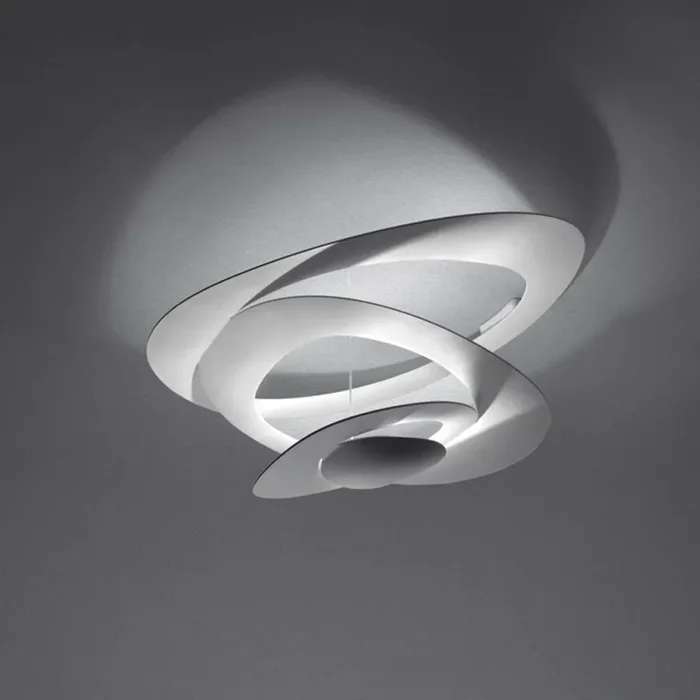 Lampada da soffitto in alluminio verniciato. Specificità: da un disco sottile si aprono volute fluttuanti, che ricadono morbidamente verso il basso, creando magici effetti di forma e luce.