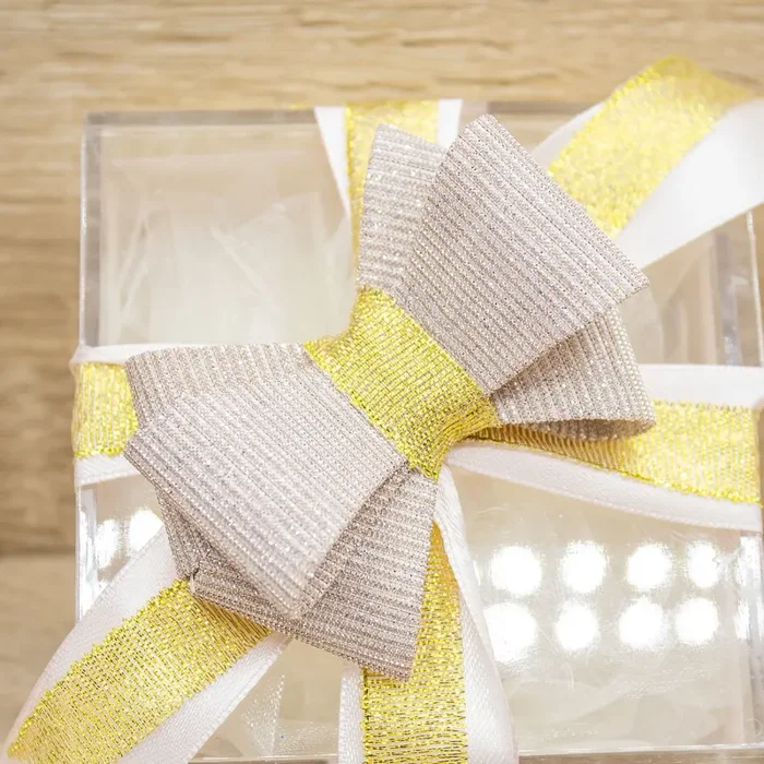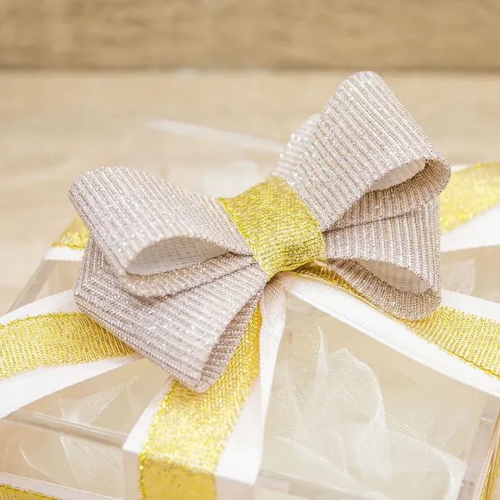 Bauletti Plex confezionati con Doppio Fiocco Rosa Cipria glitterato e nastro Rosa Cipria e Oro.