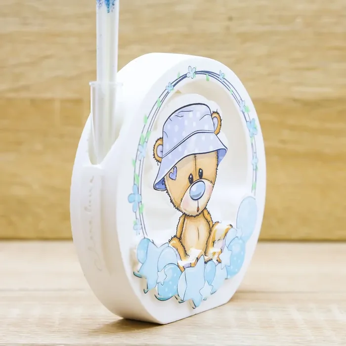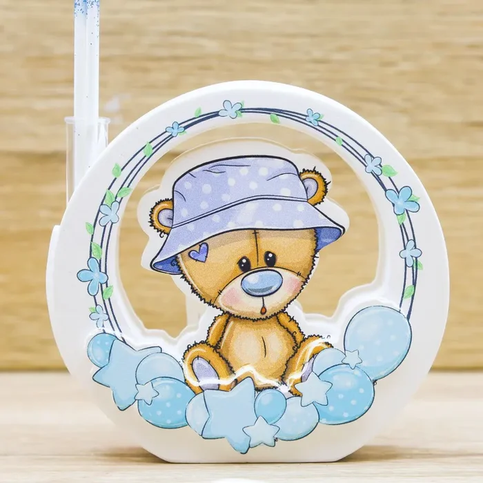 Profumatore tondo con raffigurazione di un orsetto con cappello celeste e decori di fiori, stelle e palloncini a pois, firmato Claraluna.