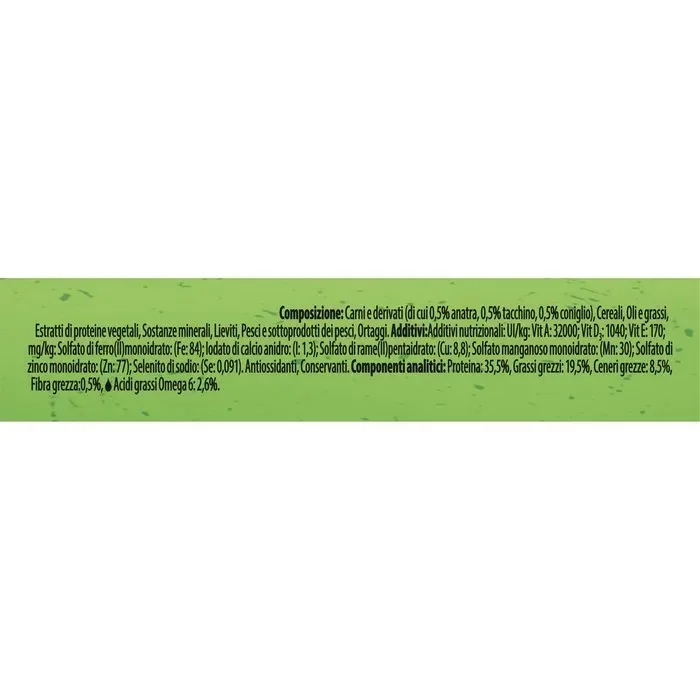 Carni e derivati (34%*) (incluso 1% anatra, 1% tacchino, 1% coniglio), Cereali, Oli e grassi, Estratti di proteine vegetali, Sostanze minerali, Zuccheri, Lieviti, Pesci e sottoprodotti dei pesci.