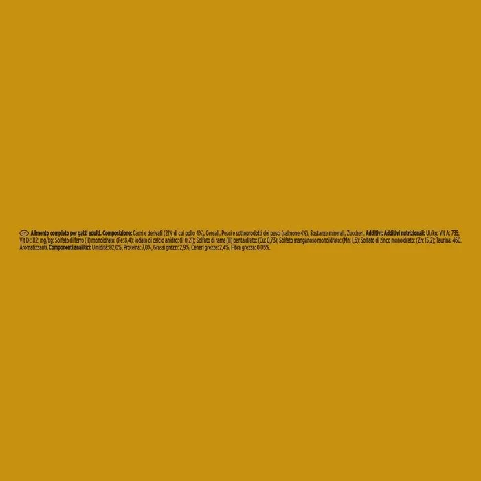 Gold dadini in salsa con salmone e pollo è un alimento completo per gatti adulti, con teneri bocconi di carne e pesce cotti alla perfezione e serviti in una gustosa salsa per deliziare ogni giorno il palato raffinato del tuo gatto.