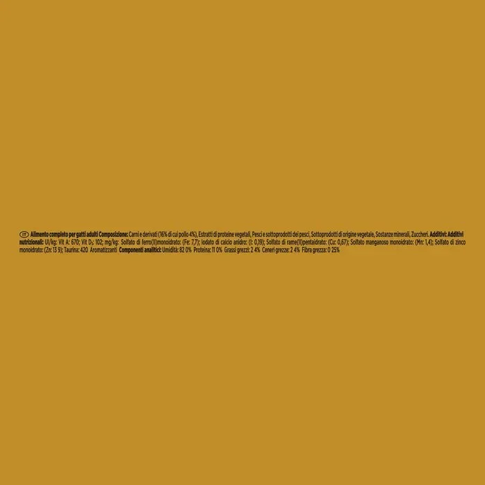 UI/kg: Vit A: 720; Vit D3: 110; mg/kg: Taurina: 460; Solfato di ferro (II) monoidrato: (Fe: 8,4); Iodato di calcio anidro: (I: 0,21); Solfato rameico pentaidrato: (Cu: 0,73); Solfato manganoso monoidrato: (Mn: 1,6); Solfato di zinco monoidrato: (Zn: 14,8). Aromatizzanti.