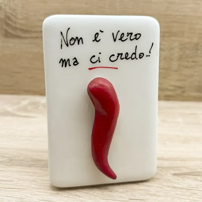 Quadretto con Corno e con frase: “Non è vero ma ci credo”, firmato Bella Napoli.