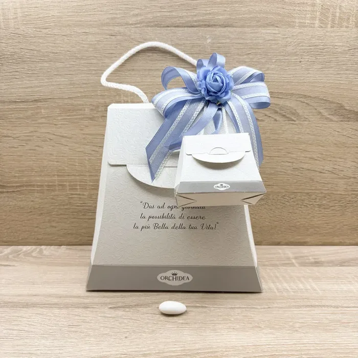 Il prezzo con la confezione comprende: Astuccio Orchidea, Doppio Nastro, Gessetto o Fiore a Scelta, Portaconfetti e 5 Confetti.