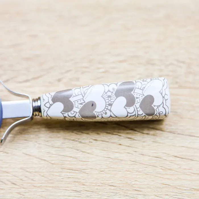 Bomboniera Utile, Taglia Piazza con manico decorato con cuoricini bianchi e tortora, firmato Claraluna.