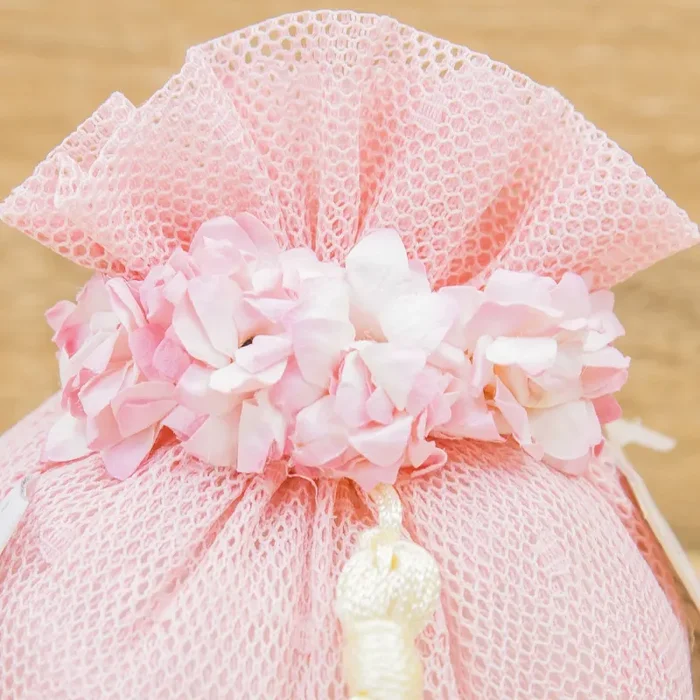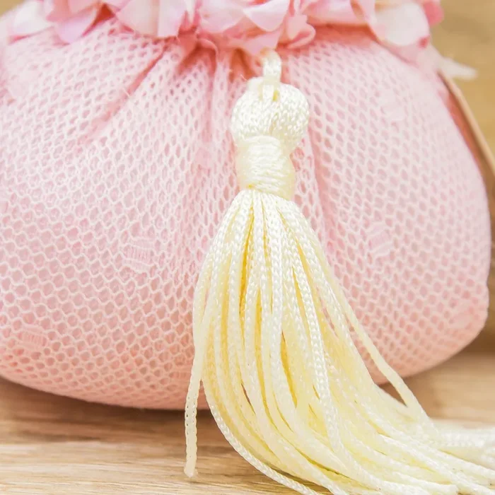 Sacchetto Rosa a Rete con Pois e nappina panna e fiorellini sfumati rosa.