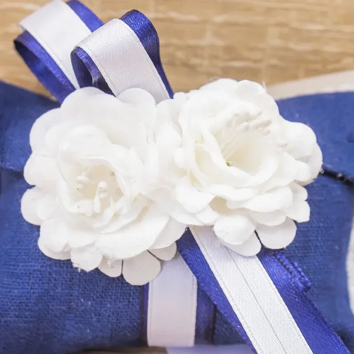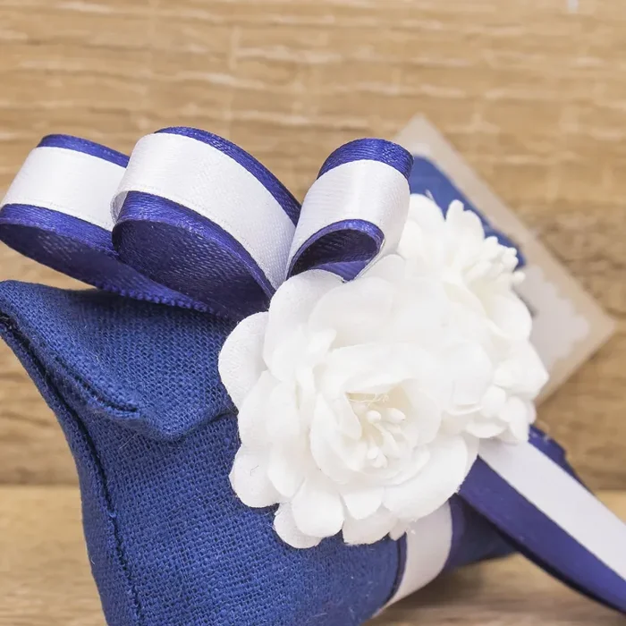 Sacchetto Blu a forma di bustina, nastro raso bianco e blu e due fiori bianchi.
