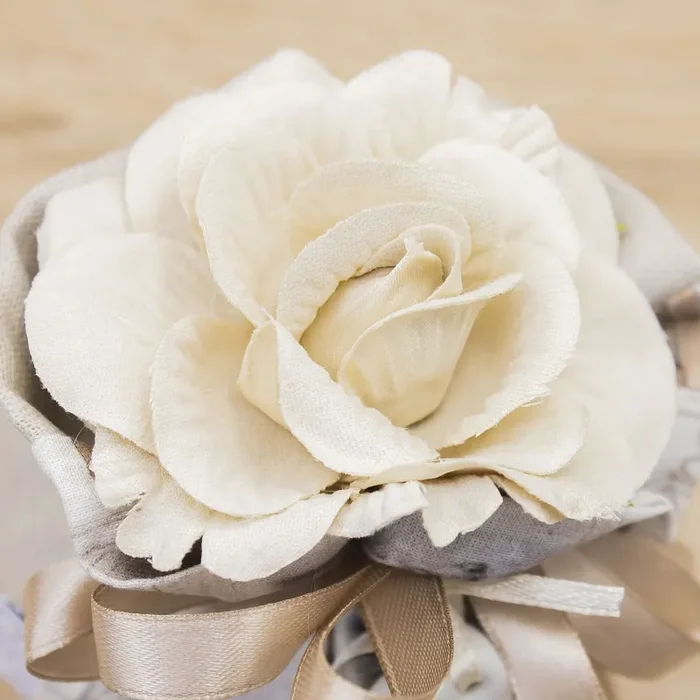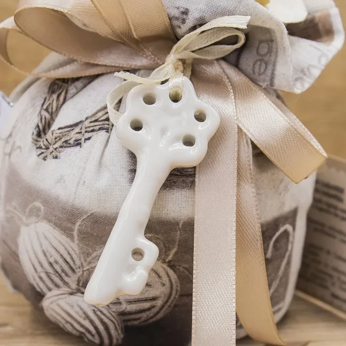 Sacchetto decorato, nastro in raso ecru e fiore grande. Applicazione di una chiave in porcellana.
