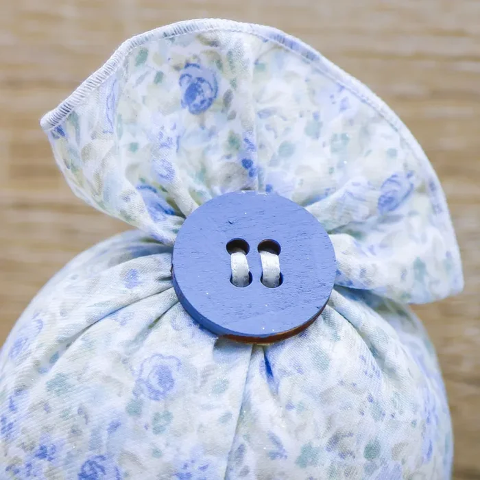 Sacchetto azzurro con Sali profumati, fragranza bucaneve, decorato con fiorellini e un bottone blu , firmato Beccalli for Life.