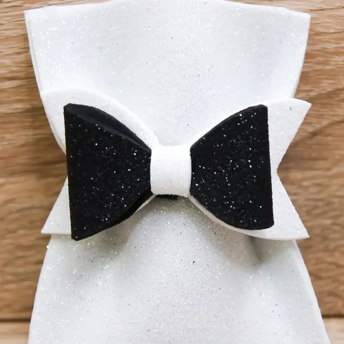 Il sacchetto è interamente realizzato con carta gommata glitterata di colore bianco e fiocco, bianco e nero, a chiusura del portaconfetti.