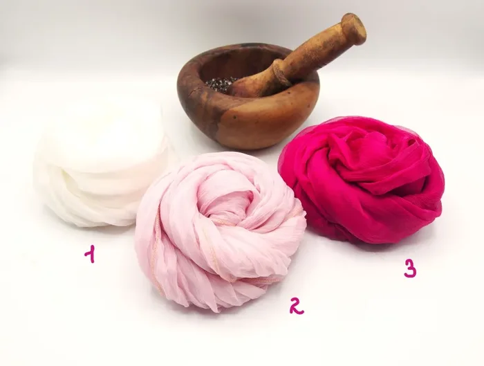 Sciarpetta dal tessuto pregiato, al tatto è leggera ad effetto plissettato e a contatto con la pelle crea una sensazione avvolgente e piacevole, 100% naturale dalla scelta della fibra alla sua colorazione, non crea allergie alla pelle.