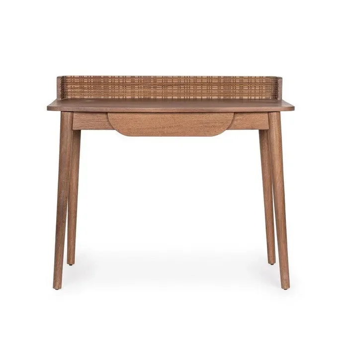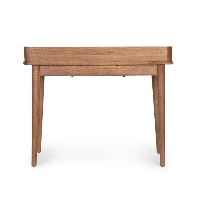 Scrivania Sanat in legno di mango con cassetto, un pezzo d’arredo raffinato che combina funzionalità e design contemporaneo. Perfetta per lo studio o l’ufficio, questa scrivania è realizzata in legno di mango con un elegante frontale intarsiato e lavorato a mano. La finitura con vernice a base d’acqua esalta le venature naturali del legno, mentre il pratico cassetto offre spazio per riporre documenti e accessori.