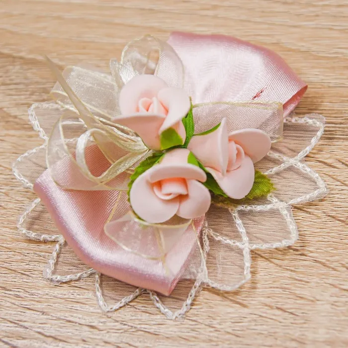 Segnaposto con Fiore in tessuto, fiocco color rosa antico, doppio fiocco in organza e tre fiorellini rosa.