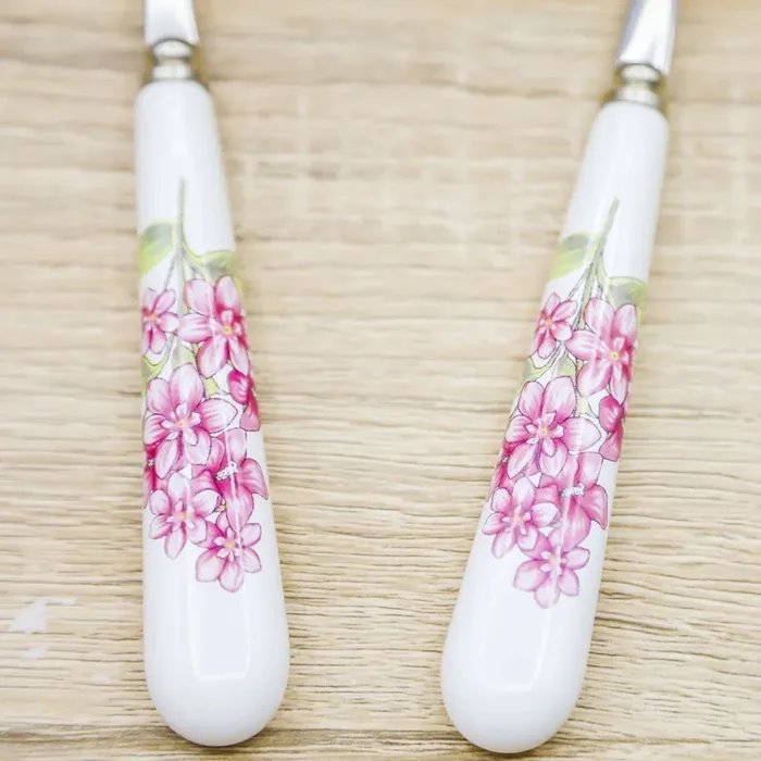 Bomboniera Utile, set posate per insalata con cucchiaio e forchetta grandi in acciaio inox con decori di fiorellini rosa sul manico di porcellana, firmata Encantada.