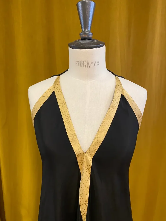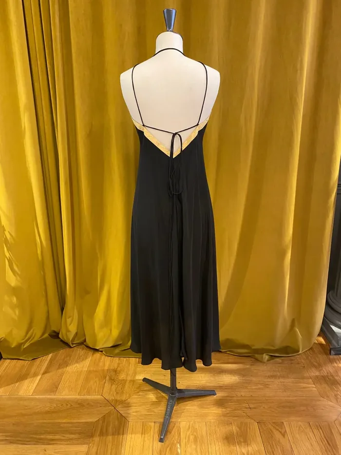 Il Sunset Silk Dress è un abito in seta, scollato a V e con una profonda scollatura sul retro, realizzato in un atelier nella giungla in India.