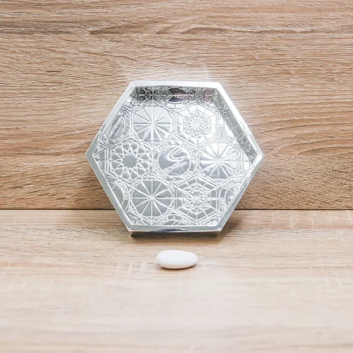 Svuotatasche dalla forma esagonale color argento con firma Gattinoni incisa.