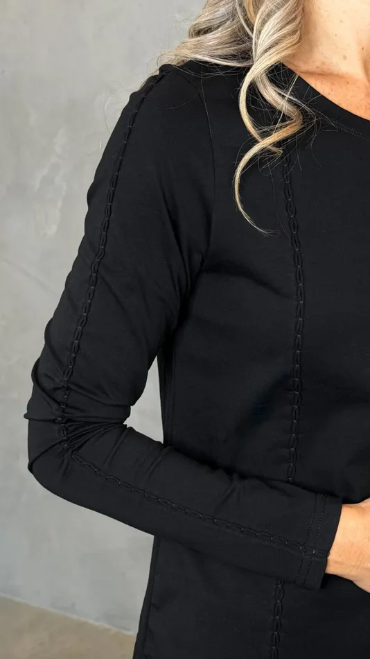 T-shirt in cotone a girocollo con dettagli in micro treccine, disponibile in tre colori: nera, bianca e beige.